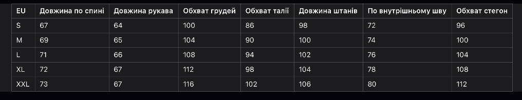 - Особливості: рукава та штани з манжетами
